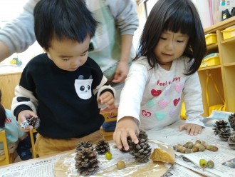 今月以上児さんは芋掘りをしたり、色んなところに散歩に出かけたりして秋の自然にたくさん触れました♩ 公園に落ちていた誰かが作ったリースを見つけ、「自分たちも作ってみたい!」という子どもたちの声からクリスマスリース作りにも発展しましたよ。写真からもいきいきとした表情が見られますね♡