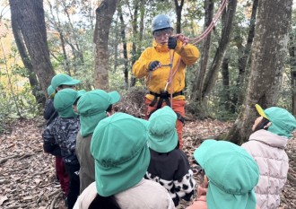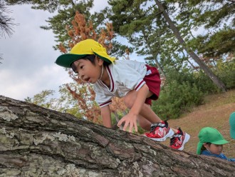 11月28日にツリーイングの体験をしました。 高い木に登って遊ぶという習慣がないので子どもたちは不安とワクワクした気持ちで挑む姿が見られました。やり方も教えてもらって実際に上に登ると見晴らしのよさを実感し、ツリーイングの面白さを経験することができました。